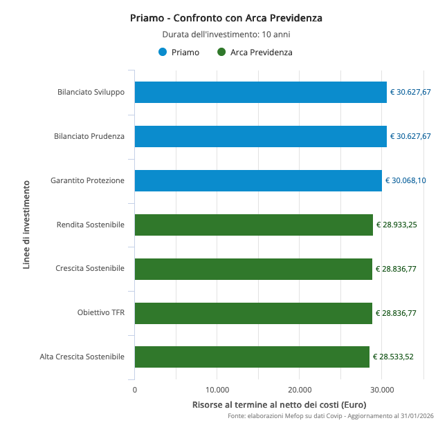Confrontando Priamo con un fondo aperto come Arca Previdenza, emerge chiaramente come i minori costi dei comparti negoziali garantiscano performance superiori a parità di rendimento lordo.