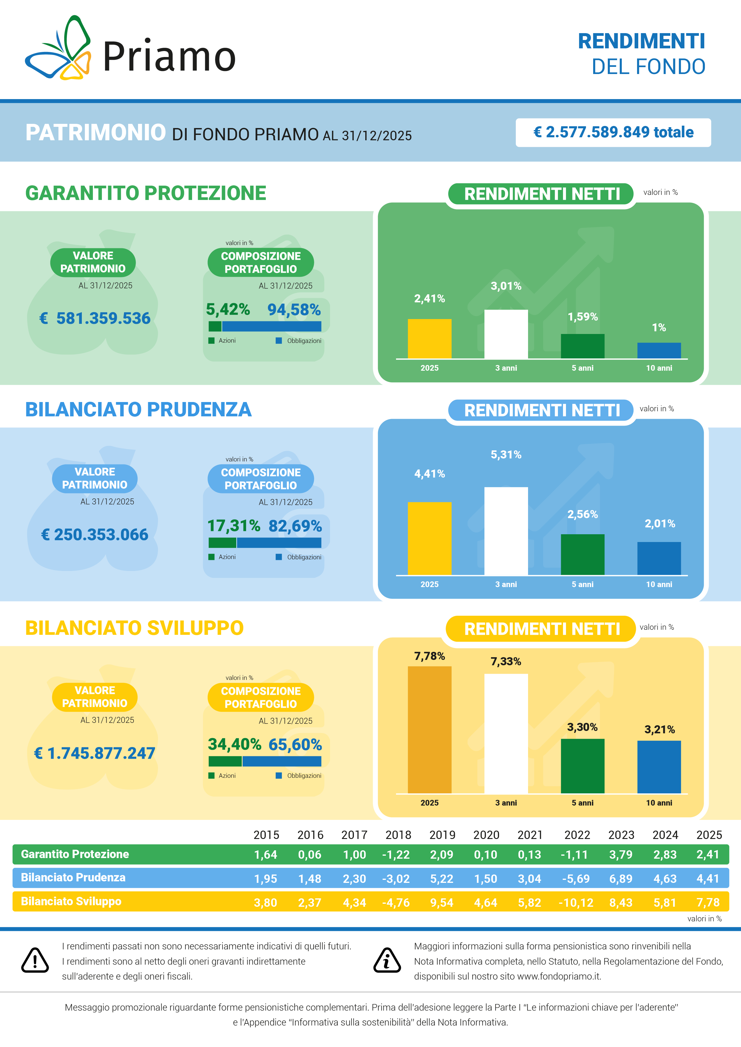 Al 31 dicembre 2025, il patrimonio gestito ha raggiunto i € 2.577.589.849, a conferma della fiducia riposta nel Fondo da oltre 129mila aderenti.
